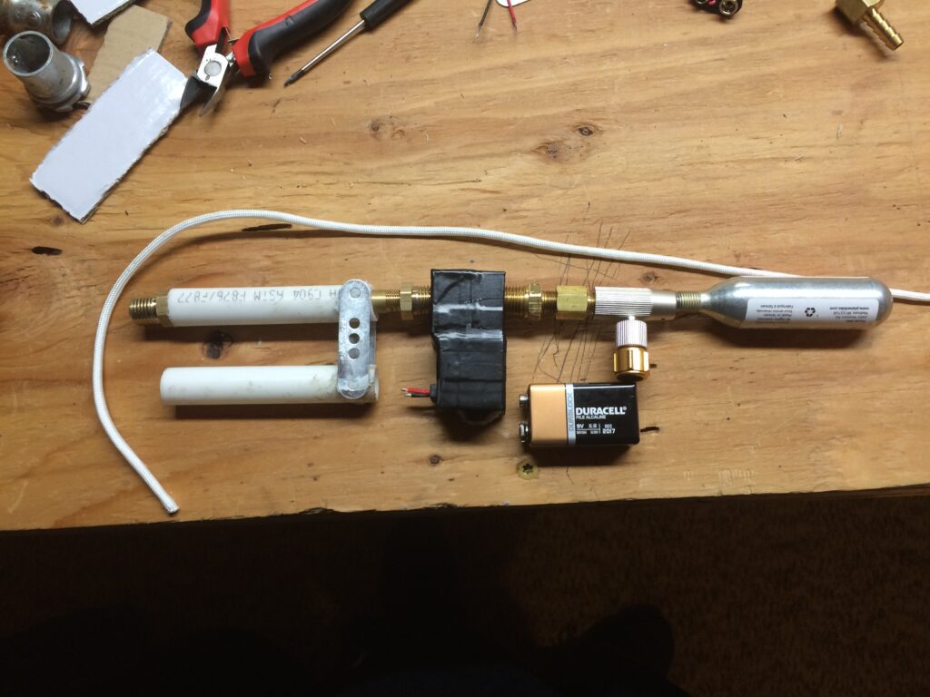The earliest design for the MK.1 used a solenoid valve. However, once the C02 cartridge was screwed in, it just blew through the valve. The spool I designed for the kevlar rope was also not very good. It was meant to wrap around in a figure 8 shape, but this wouldn’t have unspooled very well. There was also never any wrist mount designed for this version.